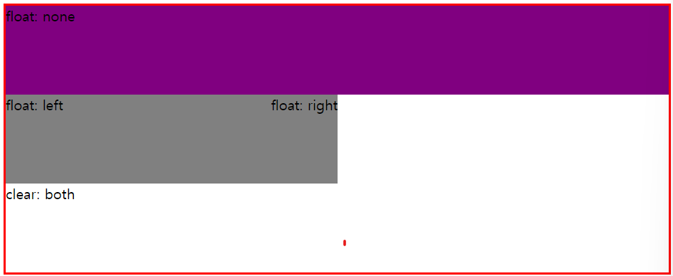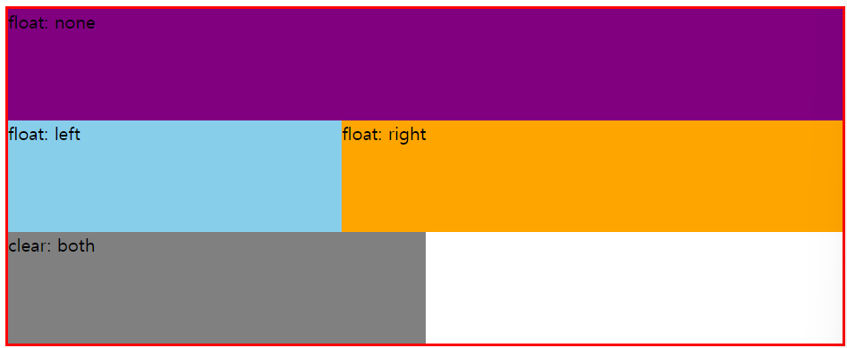 ✔️float 속성이 적용되면 다음 요소(자식요소)가 그 float 속성을 그대로 상속 받는데 left, right 상관없이 이것을 해지시키는 속성으로 clear을 사용할 수 있다.
