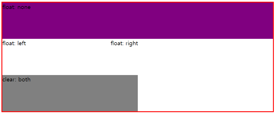clear속성은 float요소 이후에 표시되는 요소가 float을 해제(clear)하여 float요소의 아래로 내려가게 할 수 있다.