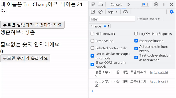 > 숫자가 올라간다는 버튼을 클릭하면 숫자만 올라가고 생존여부와는 관계가 없는데 생존여부에 따른 console이 같이 실행되는 것으로 보여지는데 ([me]로 의존성배열을 넣어줌에도 불구하고)