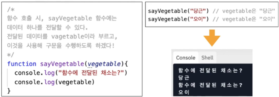 - 매개변수는 함수 선언 방식 괄호 사이에 있는 변수(선언 시 쓰이는 용어)