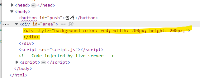 style 속성(색은red, 너비와 높이가 200px)을 지정한 요소가 생성된 걸 확인할 수 있음