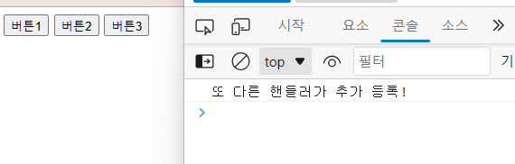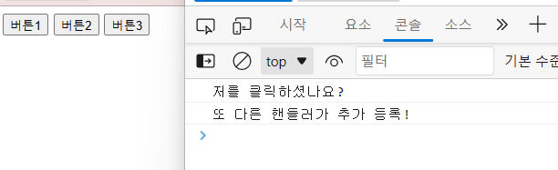 - 같은 리스너(=타겟)에 대해 다수의 핸들러를 등록할 수 있다.(이벤트 핸들러는 안됨)