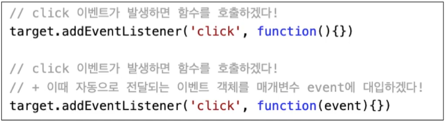 target.addEventListener('1번째인자'_발생할 수 있는 이벤트 명, 2번째인자_지정한 이벤트핸들러 함수)