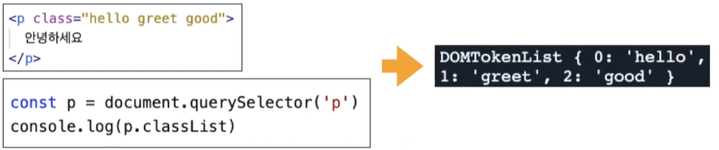 웹 요소(Element)로부터 클래스 콜렉션을 반환하는 읽기 전용 속성이다. (태그를 통해 만들어진 요소에서 클래스의 목록만 뽑아내는 속성이 바로 이 classList)
