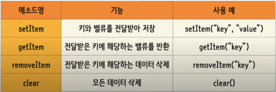 localStorage로부터 데이터를 읽거나 쓸 때에는 메소드를 이용해 접근한다. (localStorage의 데이터 이름_key은 중복될 수 없다.)