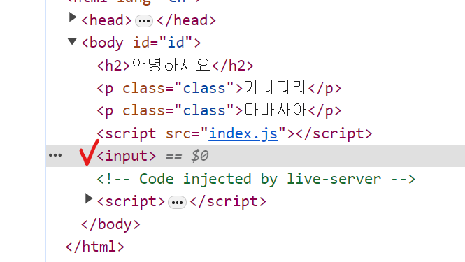 <!DOCTYPE html> <html lang="en"> <head> <meta charset="UTF-8" /> <meta name="viewport" content="width=device-width, initial-scale=1.0" /> <title>Document</title> </head> <body id = "id"> <h2 >안녕하세요</h2> <p class = "class">가나다라</p> <p class = "class">마바사아</p> <script src="index.js"></script> </body> </html>