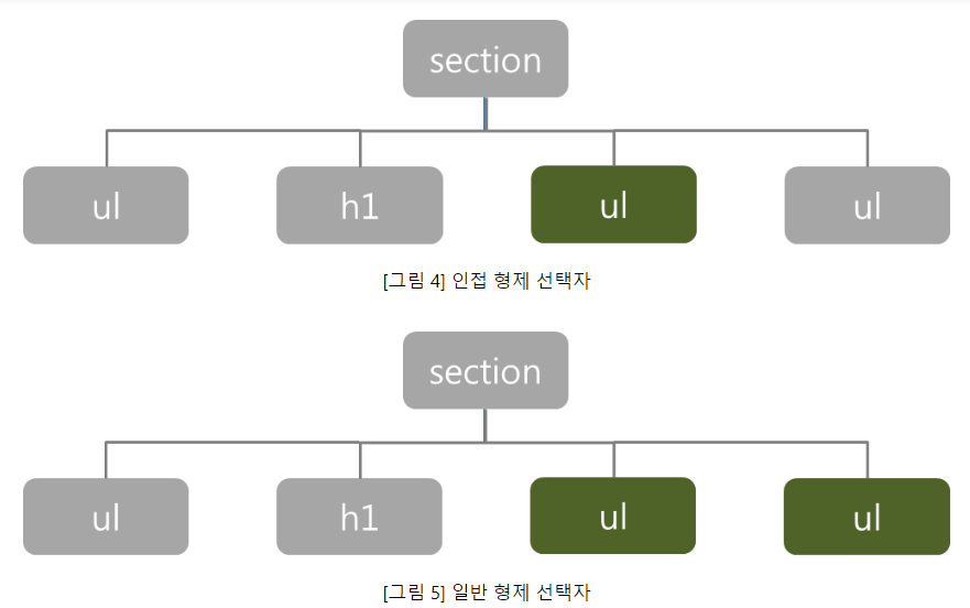 인접 형제 선택자 A + B: A요소를 뒤따르는 B요소를 선택(A와 B사이에 다른 요소가 존재하면 선택하지 않으며, A와 B가 같은 계층에 있을 때 A 바로 뒤에 B를 선택자로 지정)