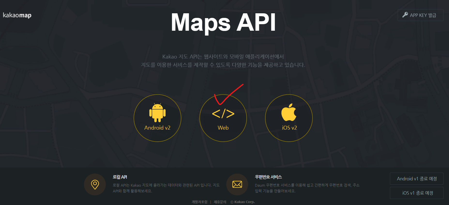 <script type="text/javascript" src="//dapi.kakao.com/v2/maps/sdk.js?appkey=발급받은 APP KEY를 사용하세요"></script>