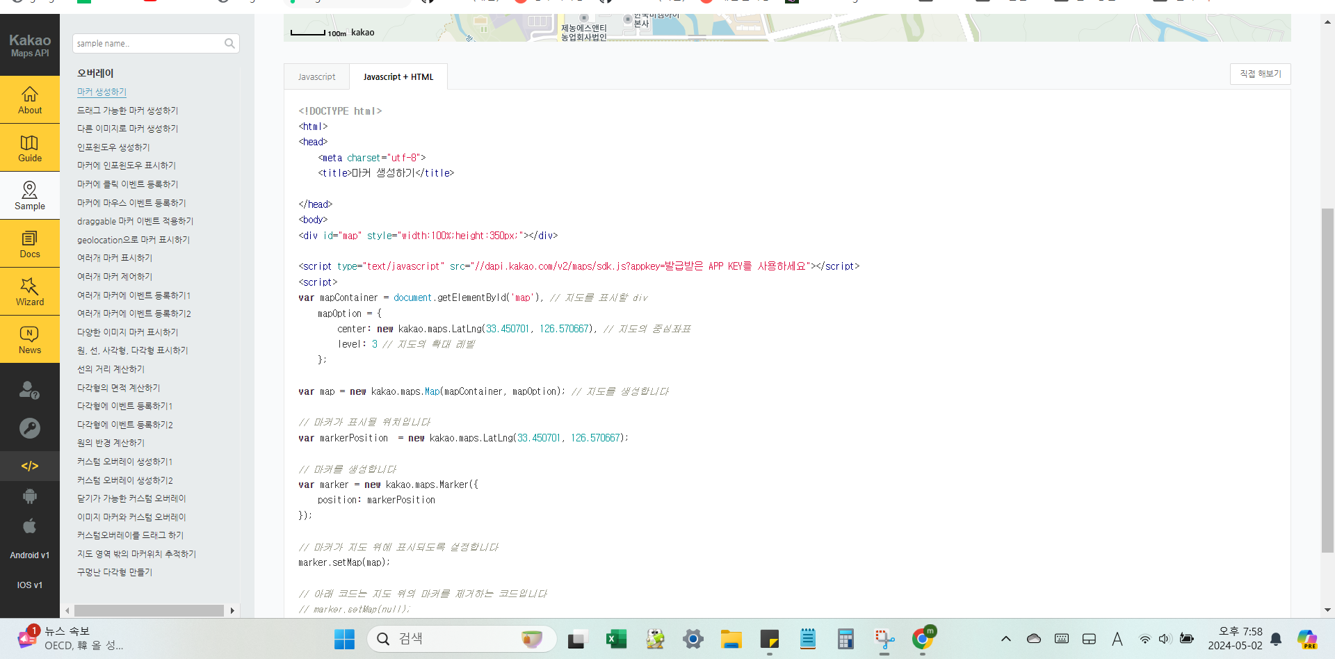 스크립트1 - 실제 지도를 그리는 js api를 불러오기_ 초기 셋에서 발급받았던 Javascript키를 여기에 넣어주면 된다.