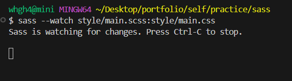 scss 폴더 내 모든 변경사항을 감지하고 css 폴더로 컴파일하도록 하려면 sass --watch input폴더 output폴더로 입력한다.