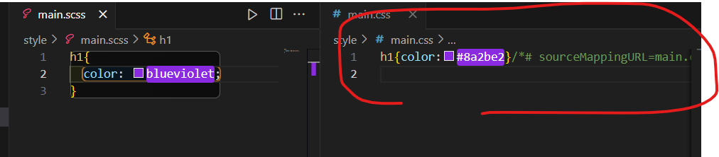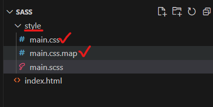 > 즉, style폴더에 있는 main.scss파일을 컴파일해서 style폴더에 main.css라는 파일로 생성해줘라는 의미가 된다.