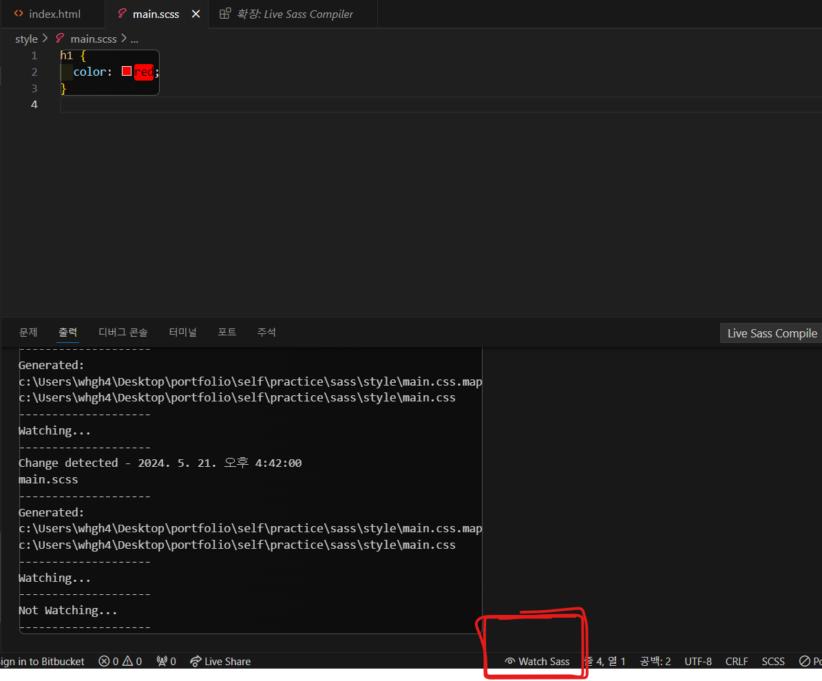 하단에 위치한 Watch Sass를 눌러주면 CSS파일로 변환을 해준다.