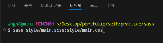 ➡️ sass 컴파일할파일이있는폴더명/컴파일할파일명.scss:컴파일한파일을위치시킬폴더명/컴파일한파일명.css