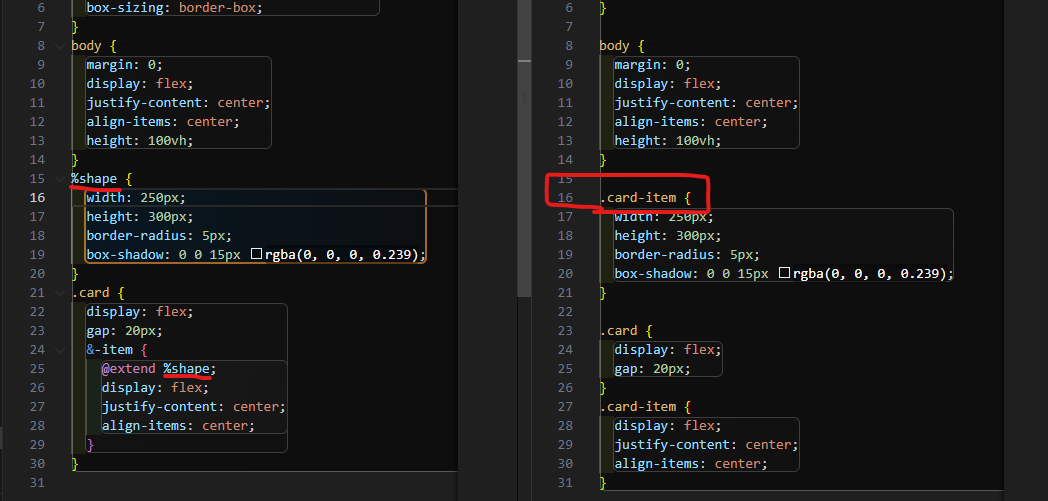 즉, @mixin은 동일한 스타일을 여러 번 사용하지만 매번 약간씩 다른 변형이 필요할 때, 매개변수를 사용하려 유연성을 높이고 싶을 때 사용하고, @extend는 여러 선택자가 완전히 동일한 스타일 규칙을 가져야 때 사용해 준다.