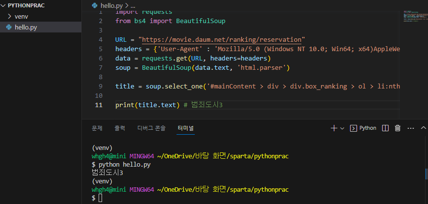 pip install bs4 : 가상환경 활성화 해주고(venv) beautifulsoup4 패키지/라이브러 추가 설치하기
