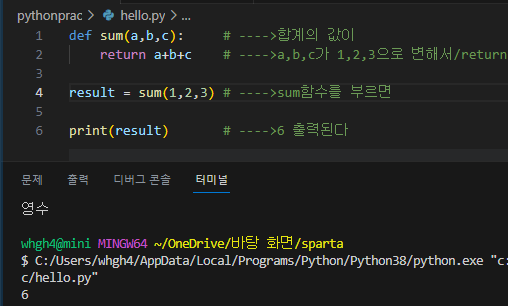 return a+b+c # ---->a,b,c가 1,2,3으로 변해서/return이 있으면 이 함수sum(1,2,3)를 그 값으로 변신시킨다
