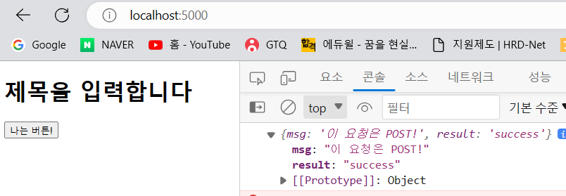 <!DOCTYPE html> <html lang="en"> <head> <meta charset="UTF-8"> <meta name="viewport" content="width=device-width, initial-scale=1.0"> <script src="https://ajax.googleapis.com/ajax/libs/jquery/3.5.1/jquery.min.js"></script> <title>Document</title> <script> // POST 요청 확인 Fetch 코드 // formData를 만들어서 formData에 데이터를 실어서 보내줌 let formData = new FormData(); formData.append("title_give", "블랙팬서"); fetch("/test", { method: "POST", body: formData }).then(res => res.json()).then(data => { console.log(data) }) </script> </head> <body> <h1>제목을 입력합니다</h1> <button onclick="hey()">나는 버튼!</button> </body> </html>from flask import Flask, render_template, request, jsonify # Flask에서 render_template, request, jsonify의 내장함수들을 사용하겠다 app = Flask(__name__) @app.route('/') def home(): return render_template('index.html') @app.route('/test', methods=['POST']) def test_post(): title_receive = request.form['title_give'] print(title_receive) return jsonify({'result':'success', 'msg': '이 요청은 POST!'}) if __name__ == '__main__': app.run('0.0.0.0',port=5000,debug=True)