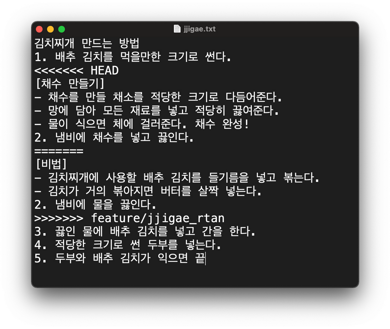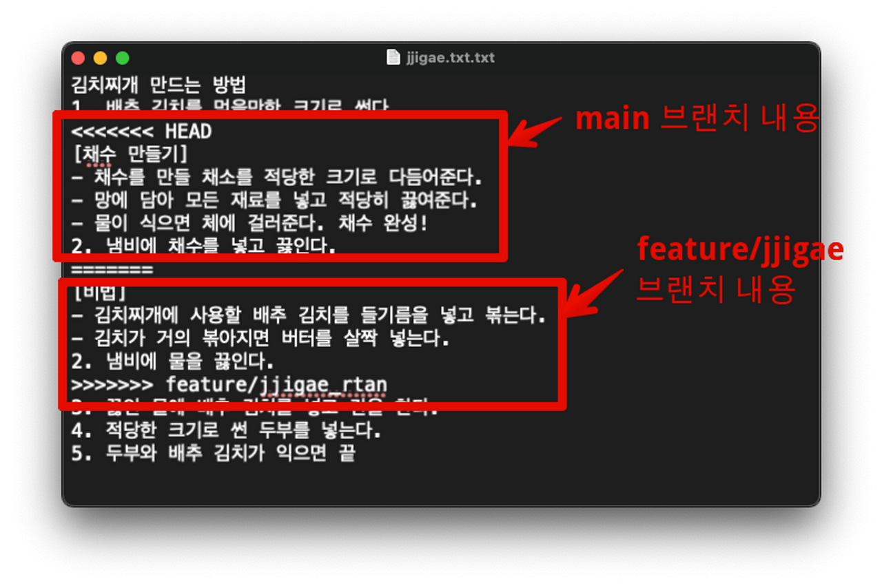 ++merge confilct 를 고치려면, 내가 원하는 대로 파일을 수정하고(어떤 내용을 반영할지 결정) <<<<<<< HEAD , ======= , >>>>>>> 충돌나는 브랜치명 또는 commmit 아이디 를 지우면 된다.